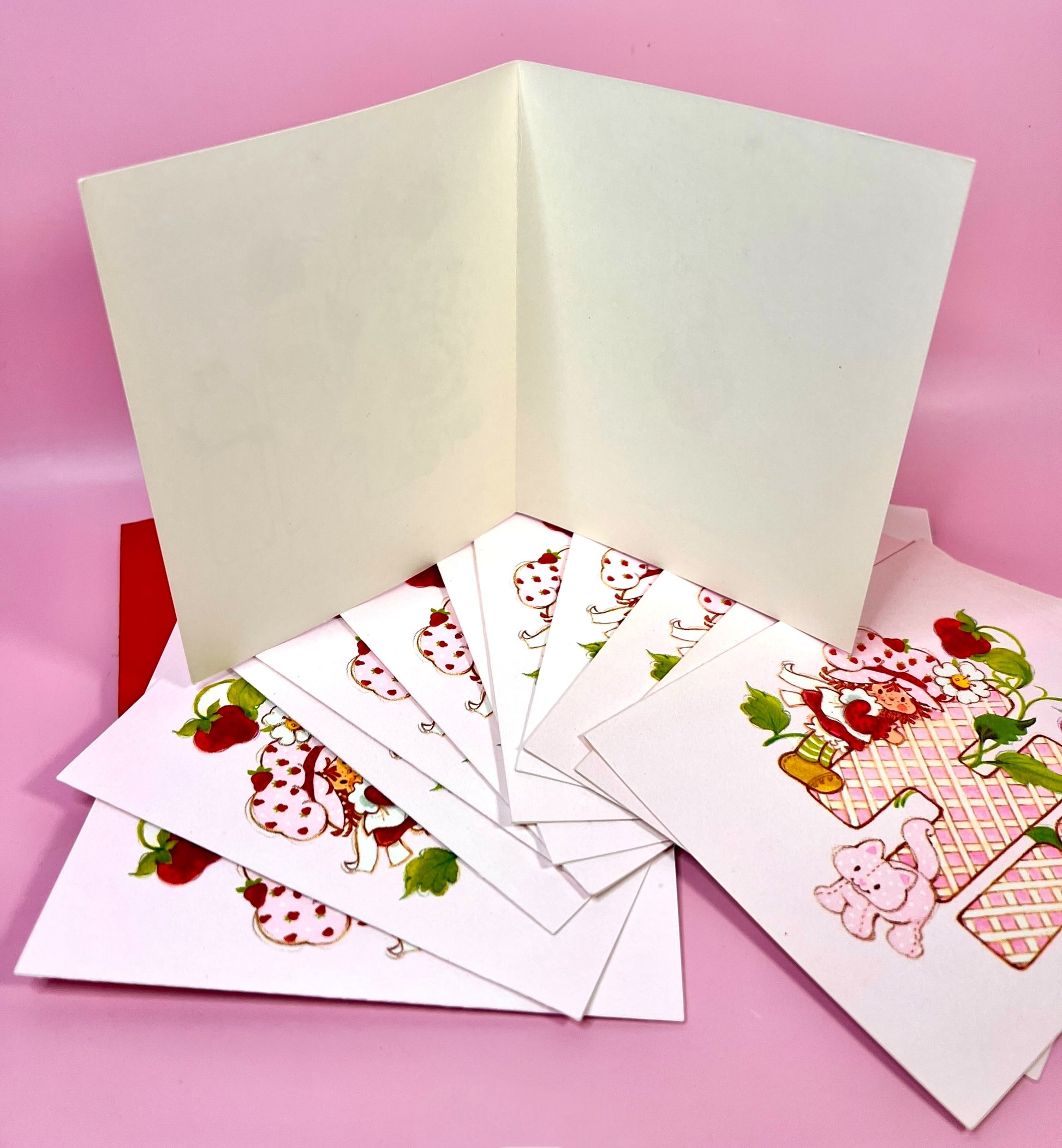Own a piece of pure nostalgia with this set of 12 unused greeting cards from American Greetings Corp marked 1980. This friendship card features Strawberry Shortcake and her pet Custard the cat, and are blank inside. This would make an adorable piece for your vintage Strawberry Shortcake ephemera collection, or would be a delightful surprise to send to an old friend. Please note the original envelopes are not included, but new appropriately sized envelopes have been substituted if you wish to mail them (approx. 4"x6")
