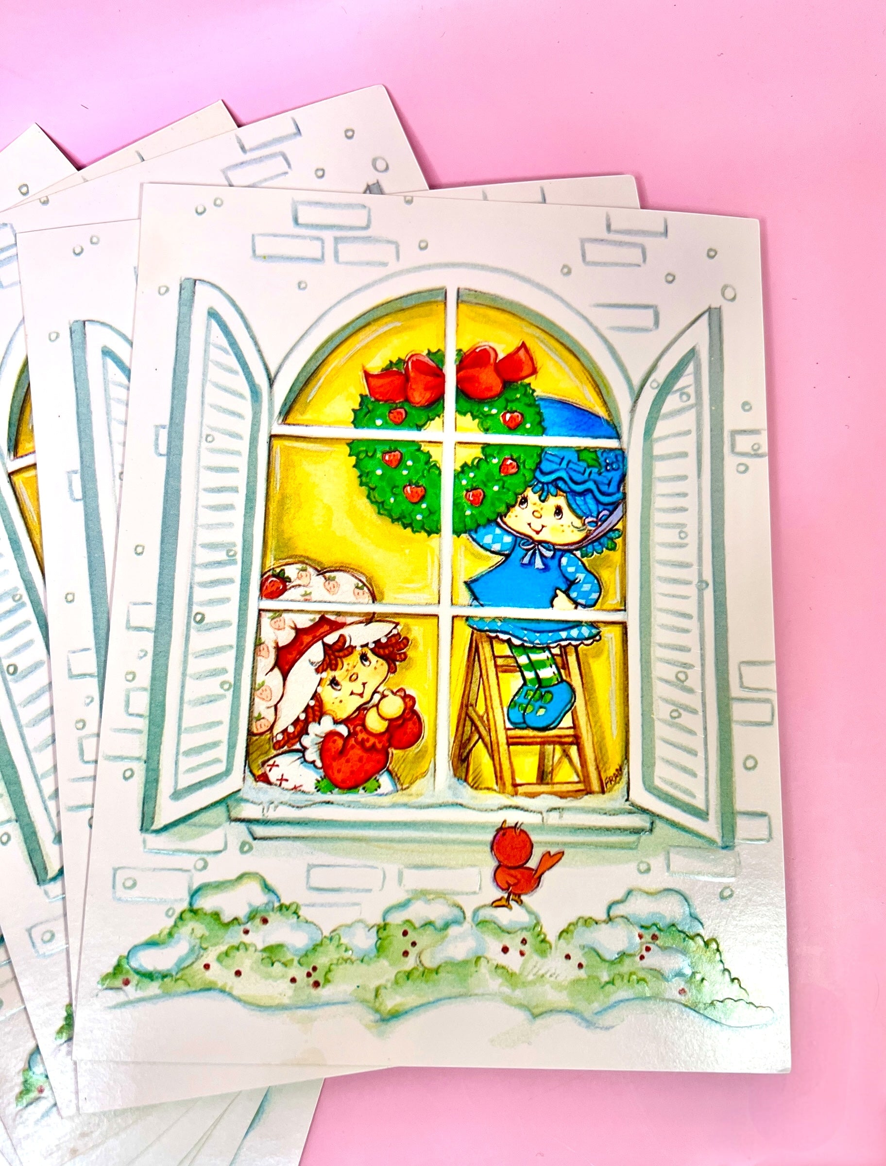 Set of 9 Vintage 1981 Strawberry Shortcake Unused Christmas Cards with Window Scene