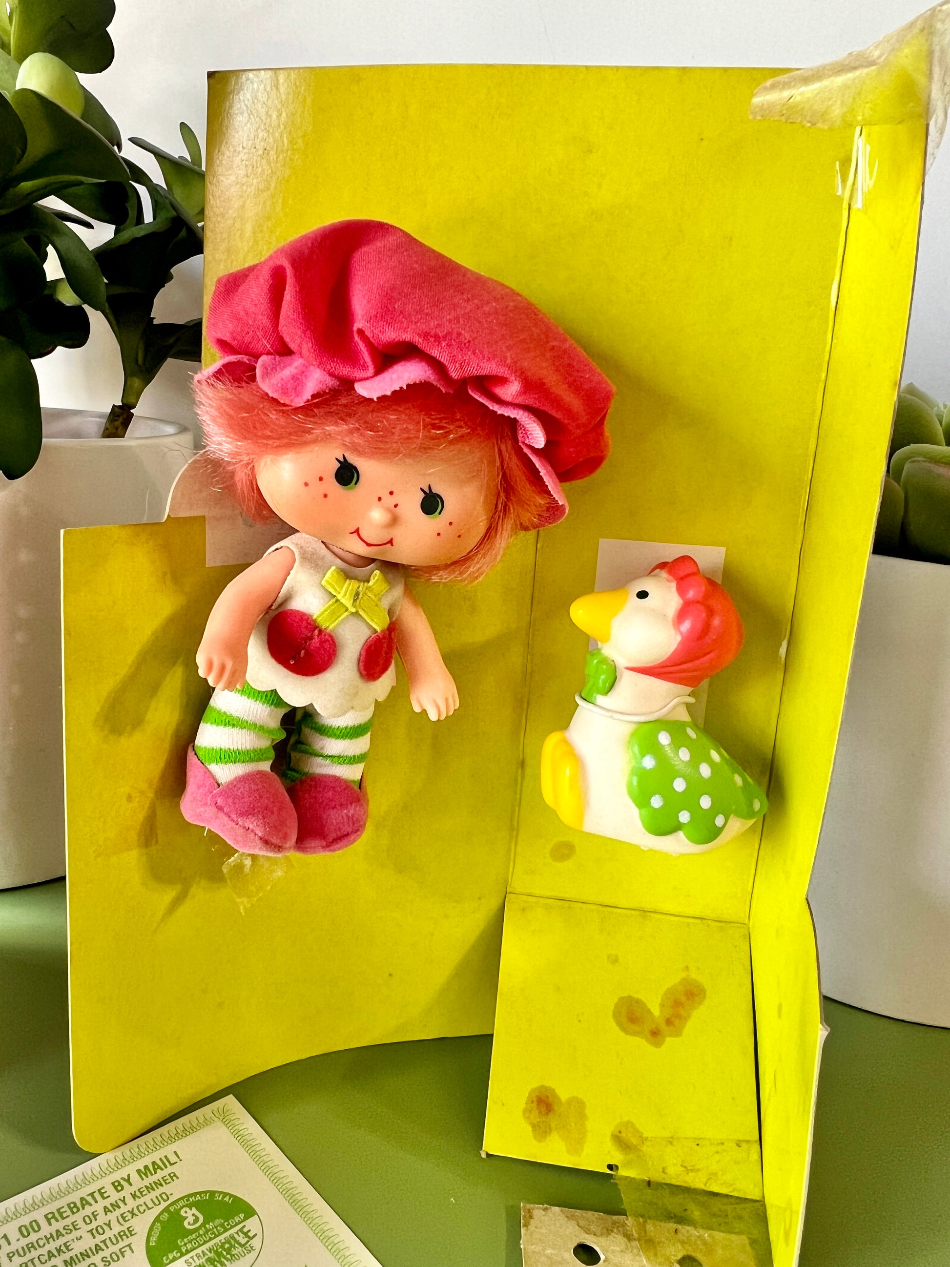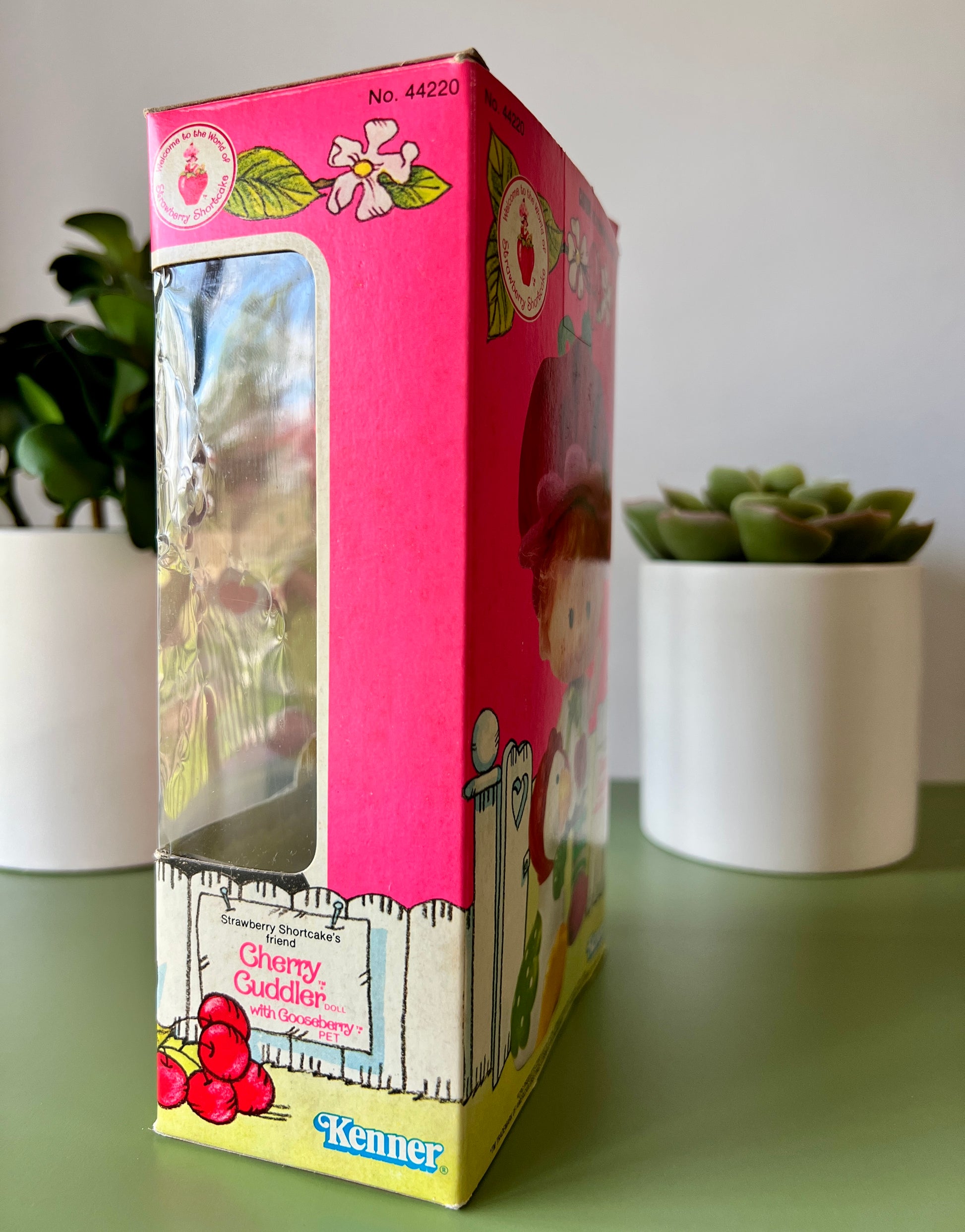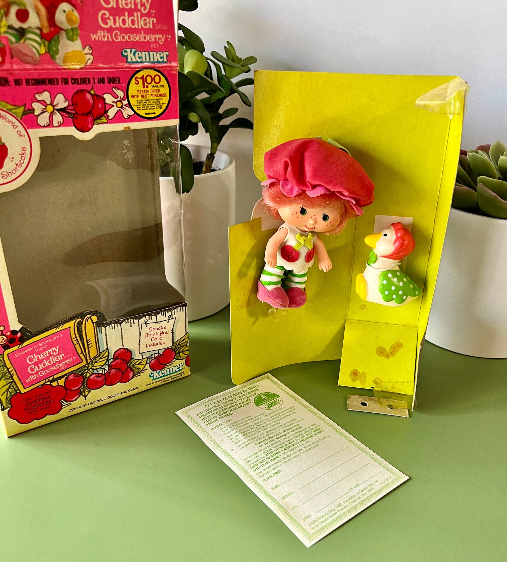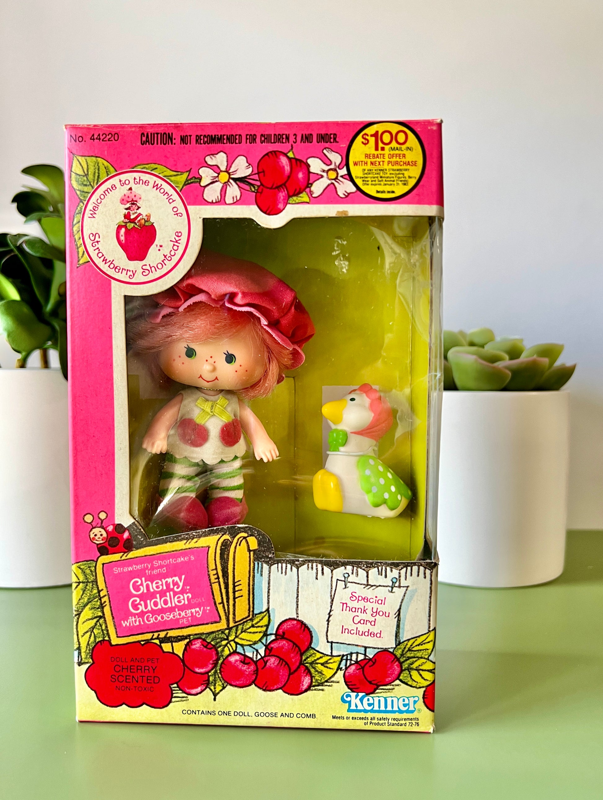 This Cherry Cuddler doll and her pet Gooseberry are in their original box and are in "Berry Good" condition! The box insert has discoloration/stains as shown, and the box cellophane has a bit of redisue from where the price tag likely was, as well as some shelf wear. She is dressed in her original dress, tights, and shoes and hat. From a front facing view the stains on the insert are not super visible, making this a nice display item for a new collector just getting into Strawberry Shortcake or those looking for a more budget friendly option. The doll also includes her original red comb, and a rebate certificate from 1982.